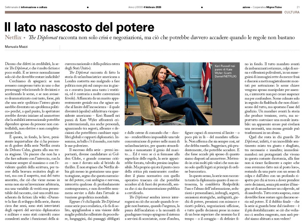 Sul settimanale svizzero «Azione», un mio commento alla serie TV su Netflix The Diplomat.