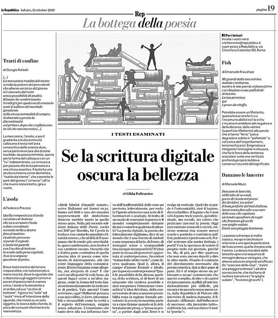 …quale lusinga! Ringrazio Gilda Policastro, critica letteraria la cui schiettezza non è inferiore alla sua simpatia. E la ringrazio non solo per aver pubblicato qualche mio verso, ma anche e soprattutto per il commento-insegnamento che tenterò di mettere a frutto nei futuri esercizi. 😊
