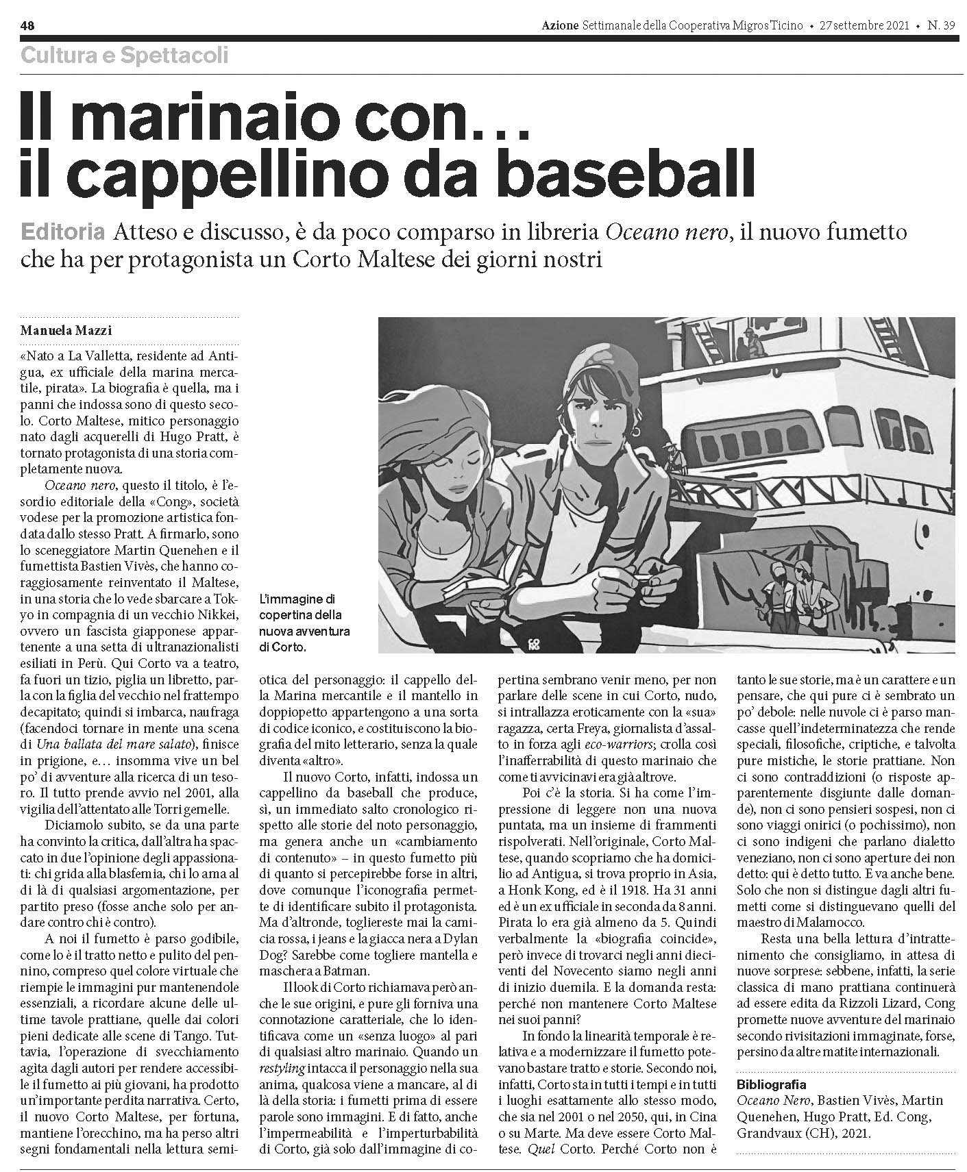 Ho parlato di Oceano nero sul settimanale «Azione» (Seguendo il link oppure scrollando verso il basso si può leggere l’articolo per intero). (Ringrazio la redazione e in particolare Simona Sala per lo spazio concessomi).