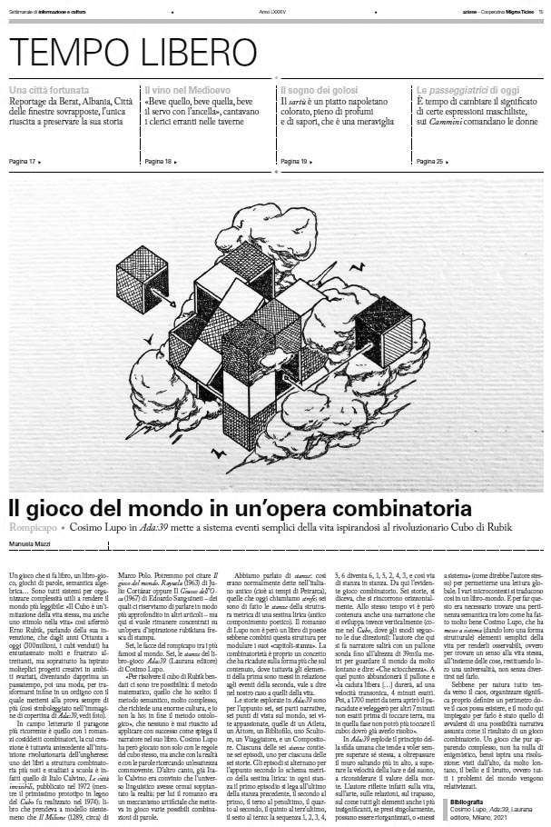 Sul numero 47 del settimanale «Azione», che ringrazio, è apparsa la mia nota di lettura su Ada:39 di Cosimo Lupo, romanzo pubblicato da Laurana Editore, per la collana Fremen.