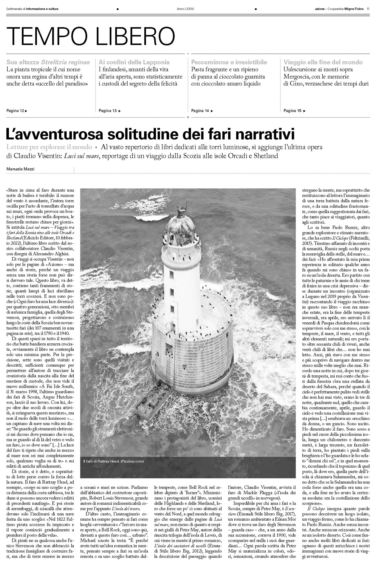 Ho letto l’ultima opera di Claudio Visentin, Luci sul mare – Viaggio tra i fari della Scozia sino alle isole Orcadi e Shetland (Ediciclo Editore, 10 febbraio 2022), e ne ho scritto su Azione.