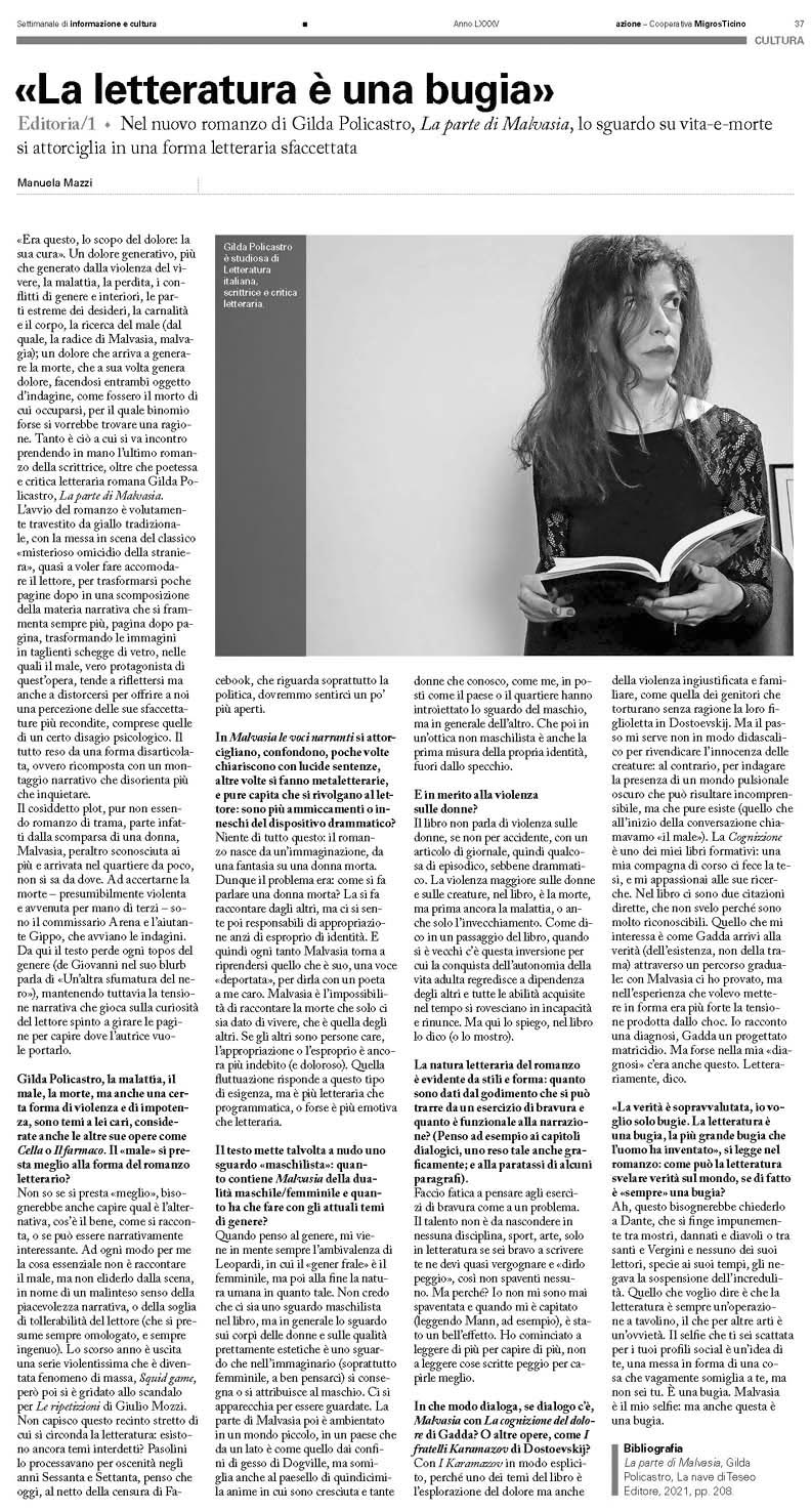 Ho letto La parte di Malvasia di Gilda Policastro (La nave di Teseo Editore, 2021) e sono lusingata per l’intervista che l’autrice mi ha concesso; ne ho scritto su Azione. La versione integrale del testo – per chi desidera leggerlo ma non ha accesso al cartaceo – si trova scrollando verso il basso oppure online (non richiede iscrizioni perché è un settimanale d’approfondimento gratuito).