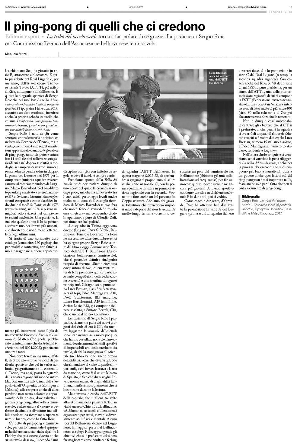 «Le squadre in Ticino oggi sono cinque (Lugano, Riva S. Vitale, Bellinzona, Tenero e Locarno) ma forse ne nasceranno altre due fra breve», ci ha spiegato proprio Sergio Roic, autore del libro e oggi Commissario Tecnico dell’ABTT Bellinzona (Associazione bellinzonese tennistavolo), che si potrebbe definire rinvigorita proprio di recente: «Siamo circa una cinquantina di soci, di cui venti tesserati (che prendono quindi parte alle varie competizioni della federazione svizzera) e una trentina di ragazzi principianti. Gli agonisti di punta sono Luca Bressan, classifica A20 svizzera (il top), Fabio Mantegazza, A18, Paolo Scartezzini, B15 maschile, Laura Bartolommei, A19 femminile, Stefan Lazic, B12, già campione ticinese assoluto, e Simone Bertoli, C10, che è anche il nostro allenatore».