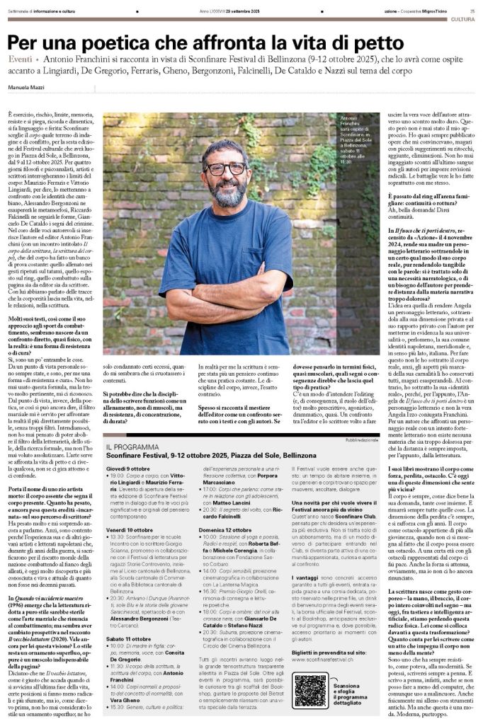 Presente, sarà ovviamente l’ideatore del progetto letterario, Andrea Bertagni; suo il compito di spiegare soprattutto le ragioni per cui ha scelto di dedicare alcune pagine del settimanale non ad articoli ma a testi di altra natura, e principalmente narrativa-letteraria. Ospiti dell’incontro, saranno anche due dei tredici autori partecipanti, ovvero Dario Galimberti (con un racconto su Lugano) e Manuela Mazzi (con un racconto su Locarno), che spenderanno qualche parola sui loro testi.