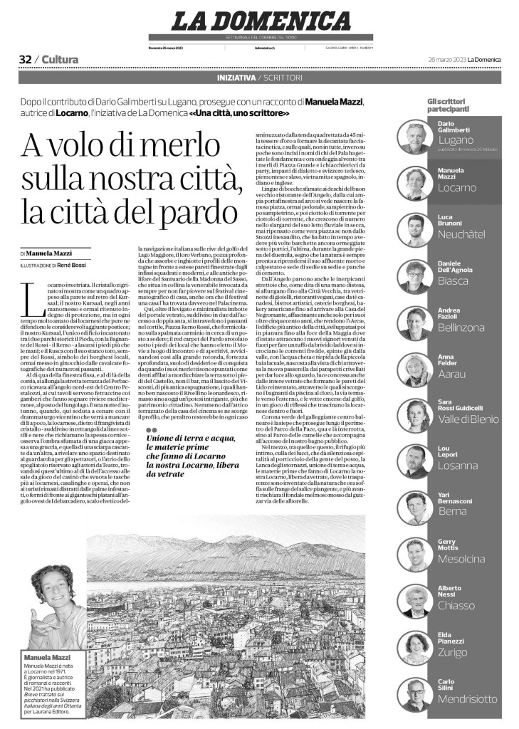 Su “La Domenica” del Corriere del Ticino, grazie ad Andrea Bertagni che ha ideato e cura la bella rubrica “Una Città, uno scrittore”, è apparso il racconto di Ma.Ma. dedicato a Locarno, e scritto svestendo i panni della giornalista per indossare quelli della “scrittrice”.