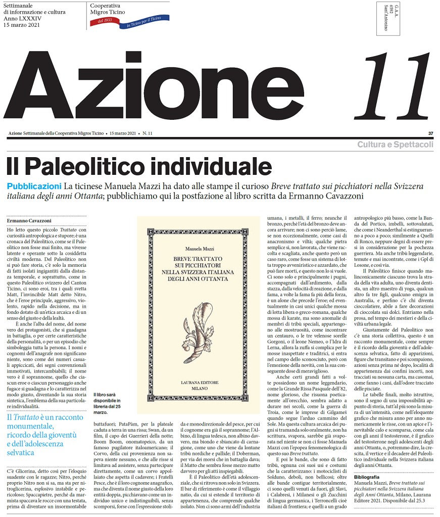 Nel settimanale “Azione“, del 15 marzo 2021 è stata pubblicata – sia in versione cartacea sia in versione online – la postfazione di Ermanno Cavazzoni al libro “Breve trattato sui picchiatori nella Svizzera italiana degli anni Ottanta”…