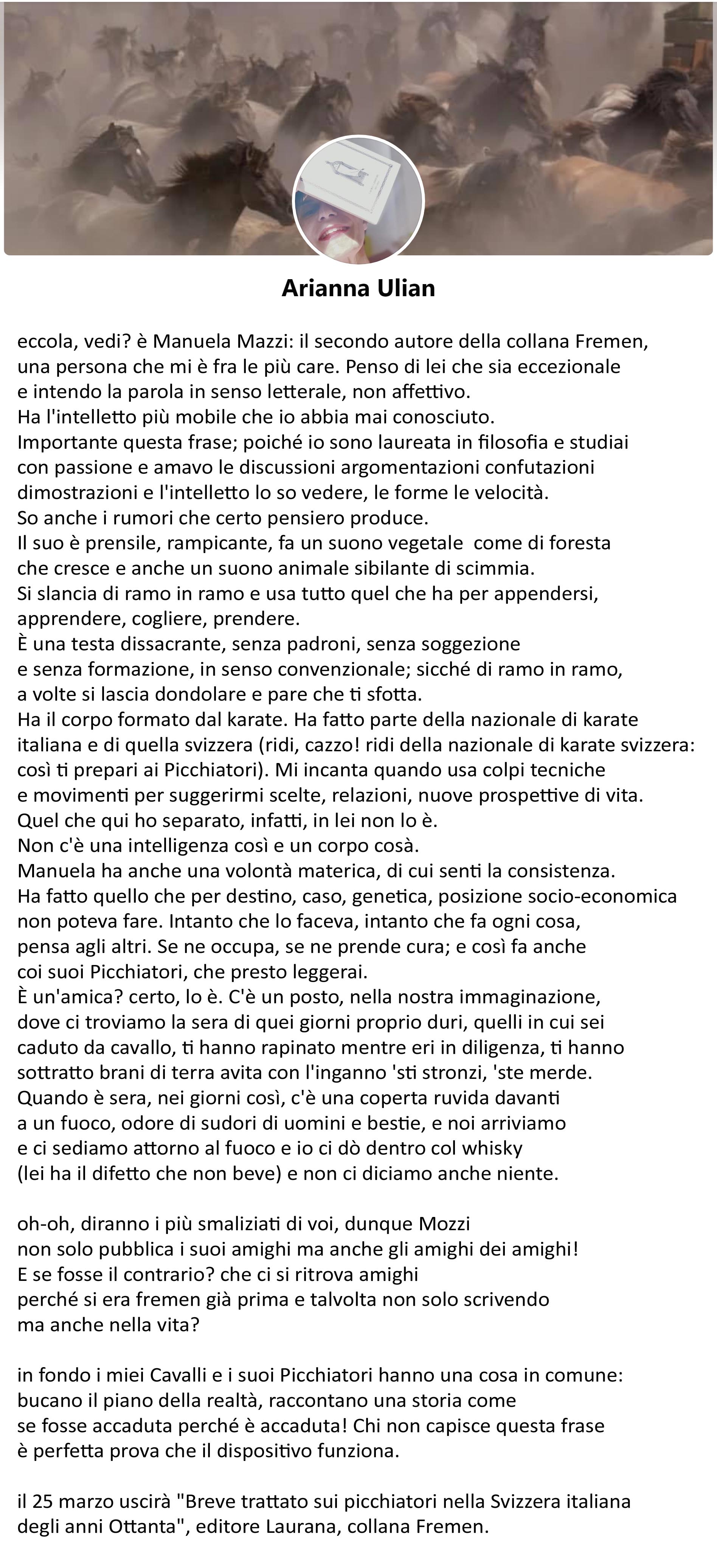 L’amica Arianna Ulian che ha firmato il primo romanzo della collana ‘fremen’, La questione dei cavalli, il 18 marzo 2021 ha speso qualche parola sull’imminente uscita dei Picchiatori, in un post su Facebook. Nei suoi occhi mi sono riconosciuta. E per questo le sono molto grata.