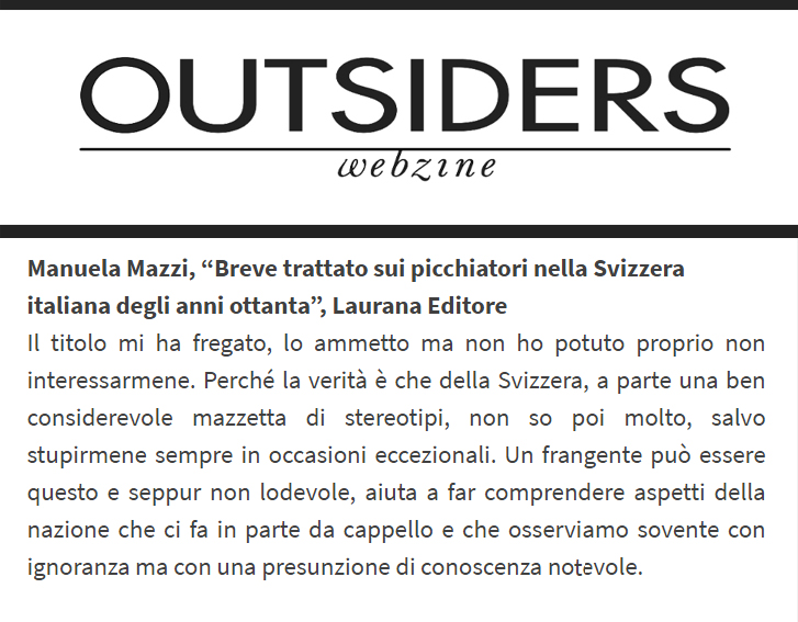 «Estremo messaggio al lettore: il Breve trattato sui picchiatori nella Svizzera italiana degli anni Ottanta, di Manuela Mazzi, è un libro che si può leggere con piacere e profitto; oseremmo dire: è un libro da leggere, e che ti darà piacere e profitto. E, per goderlo e apprezzarlo, non è minimamente necessario essere svizzeri (mentre, va detto, è utile – benché non indispensabile – avere qualche memoria degli anni Ottanta: il punk, i paninari, quella roba là)».