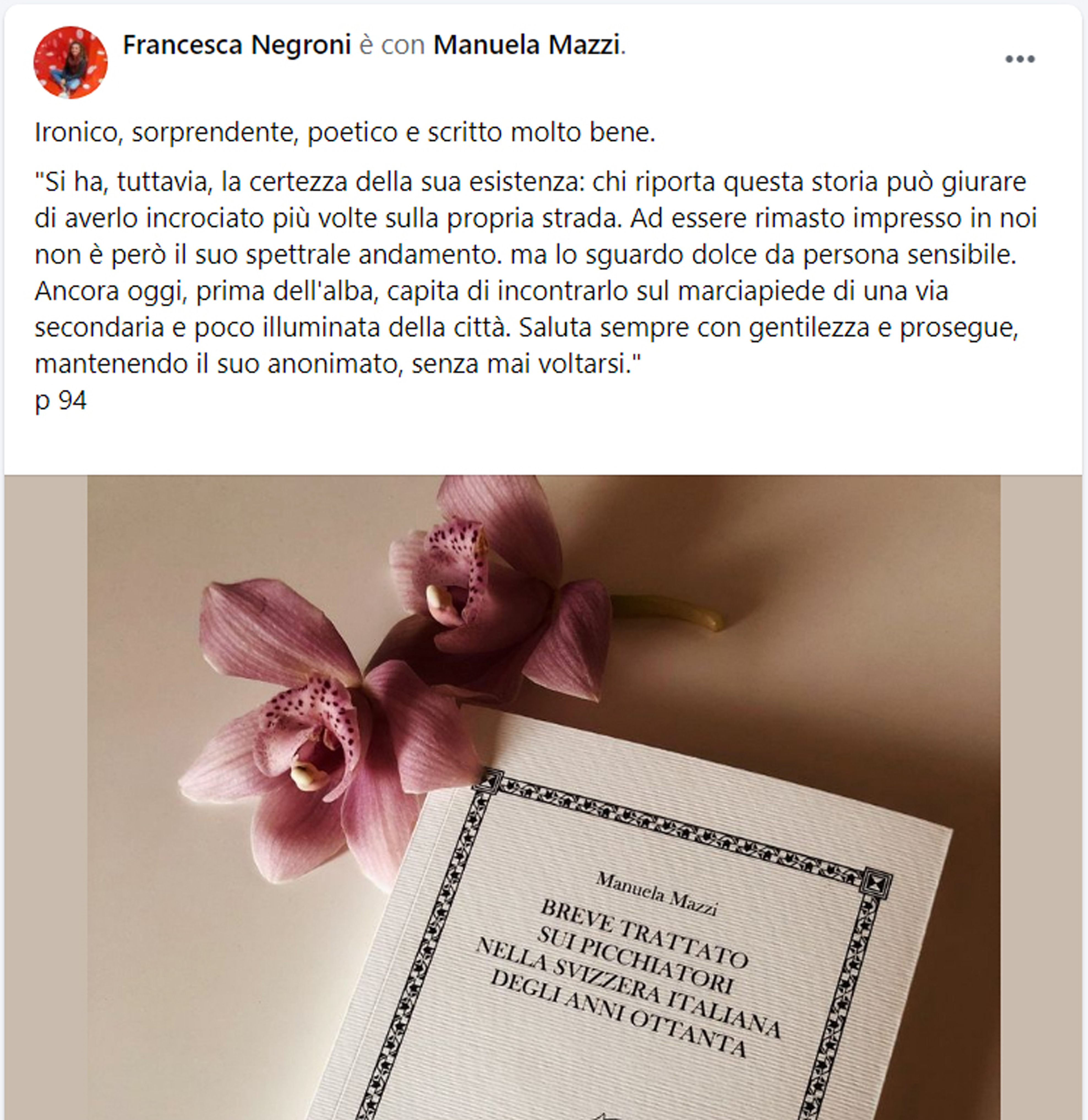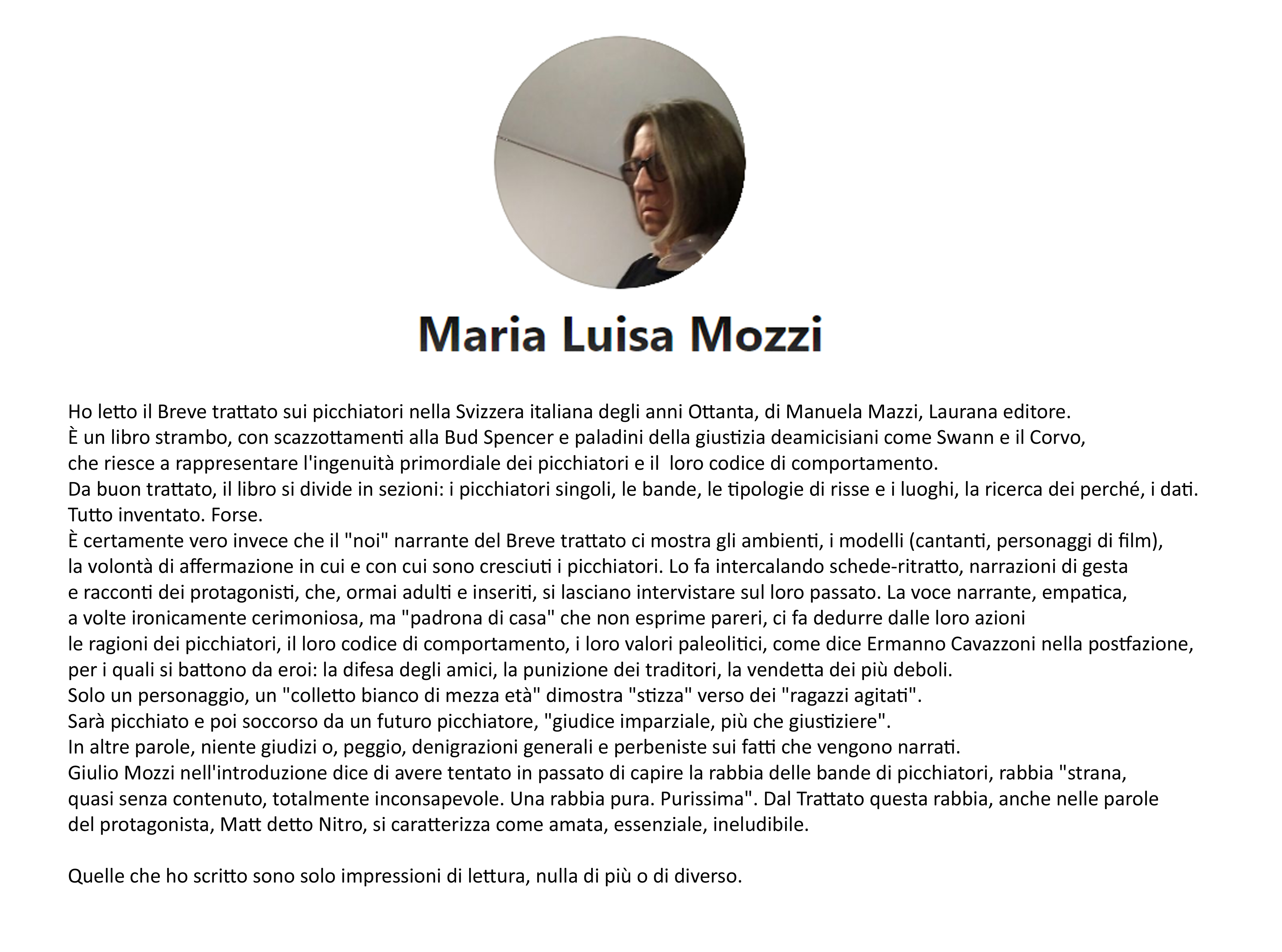 «Ogni tanto mi capita di essere d’accordo con Giulio Mozzi. Per esempio, quando descrive la scrittrice Manuela Mazzi come una persona “empatica, altruista e dotata di un’intelligenza straordinariamente prensile”. O quando dice che il suo strano oggetto – non so come chiamarlo e tra poco vi spiegherò perché – merita di essere accostato a certe Vite di Giuseppe Pontiggia o Ermanno Cavazzoni e ha un titolo, Breve trattato sui picchiatori nella Svizzera italiana degli anni Ottanta che è “settecentescamente spropositato”.»