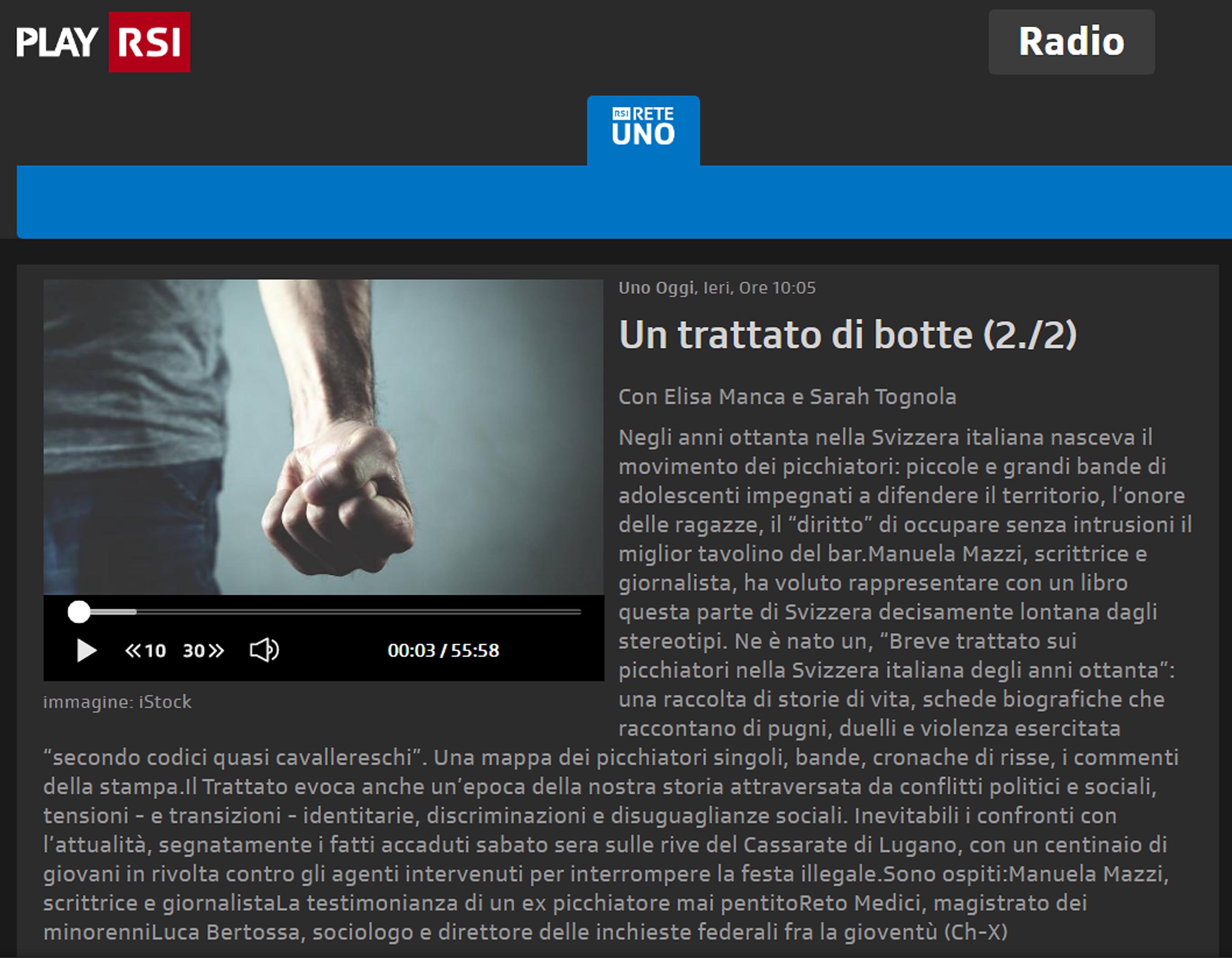 Ai microfoni di ReteDue della RSI, con Mario Fabio che cura la trasmissione Diderot – Le voci dell’attualità per parlare del Breve trattato sui picchiatori della Svizzera italiana negli anni Ottanta (Laurana editore). L’intervista è andata in onda in diretta il 29 marzo 2021. Ringrazio ReteDue, Mario Fabio, Barbara Camplani e Mattia Pelli.