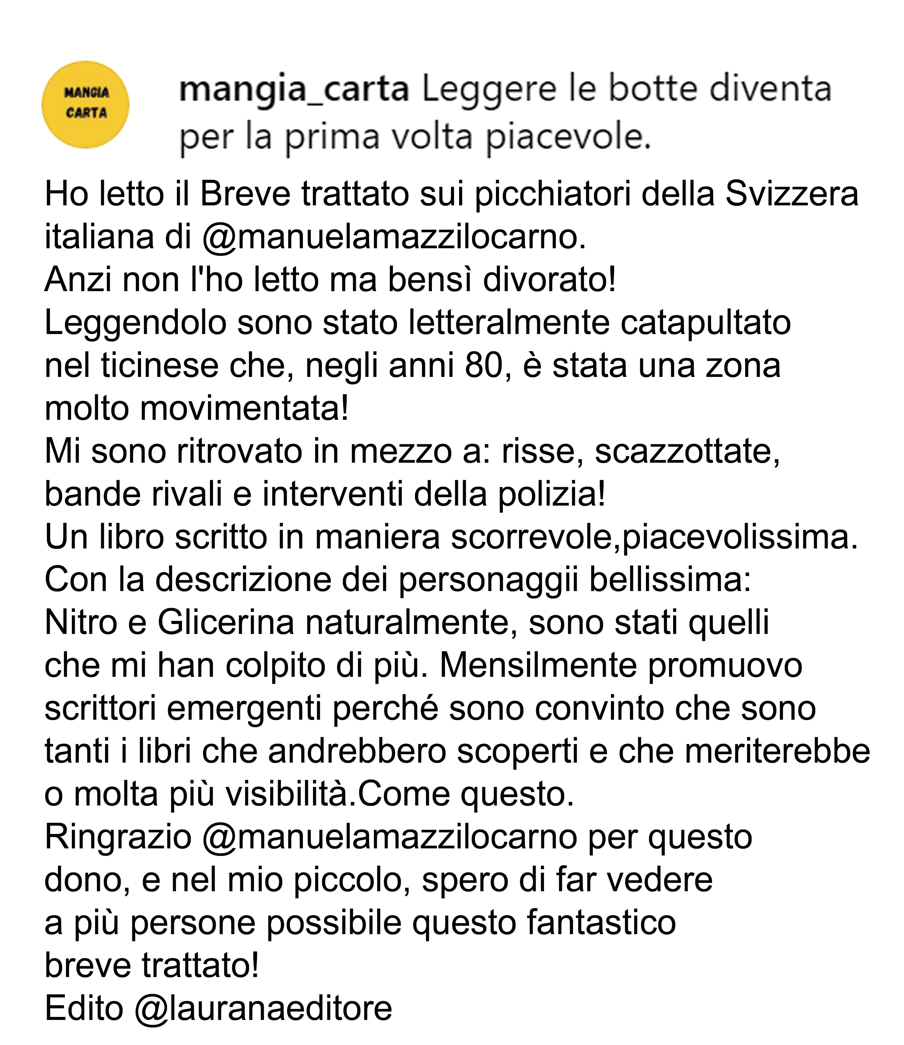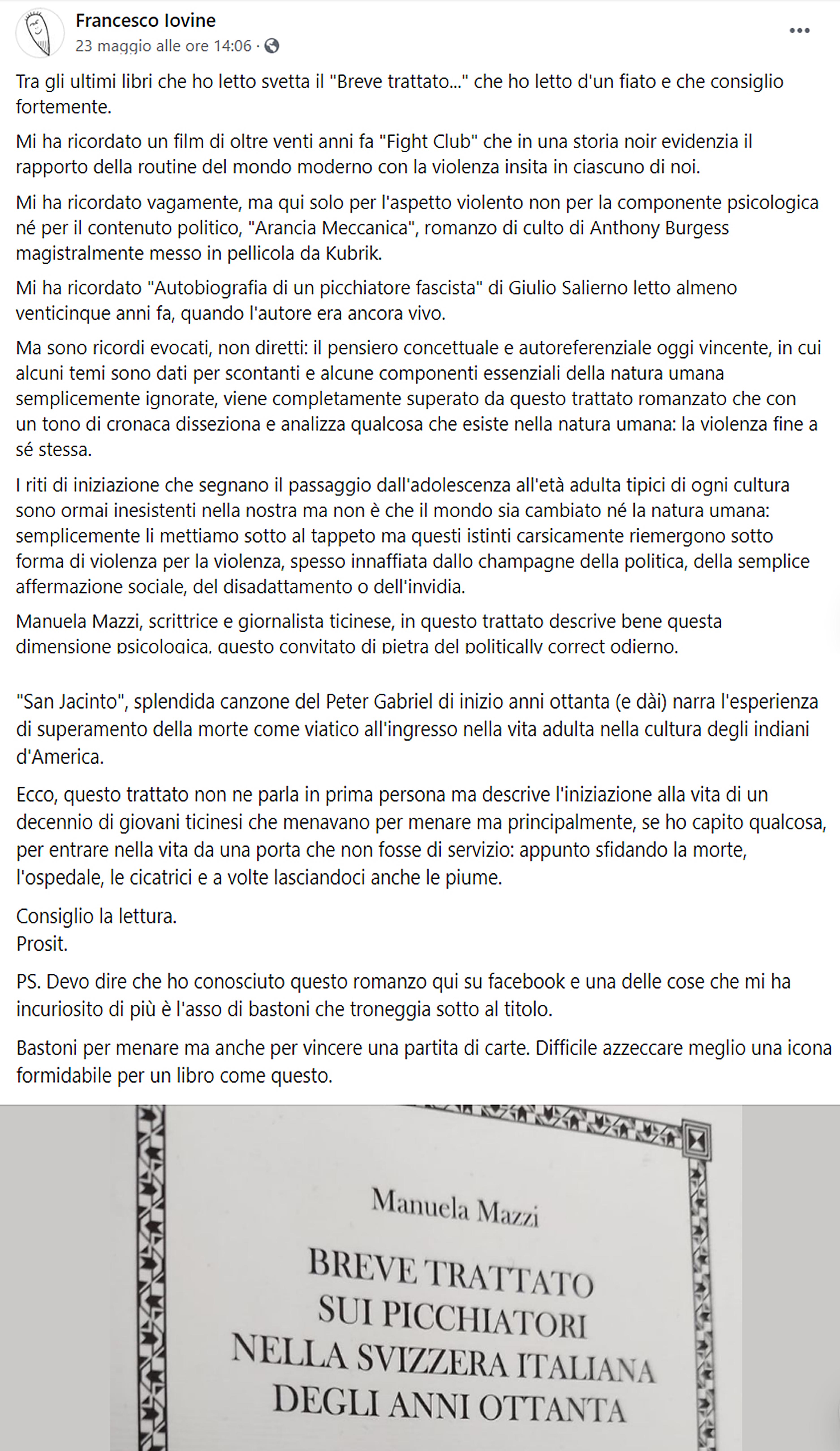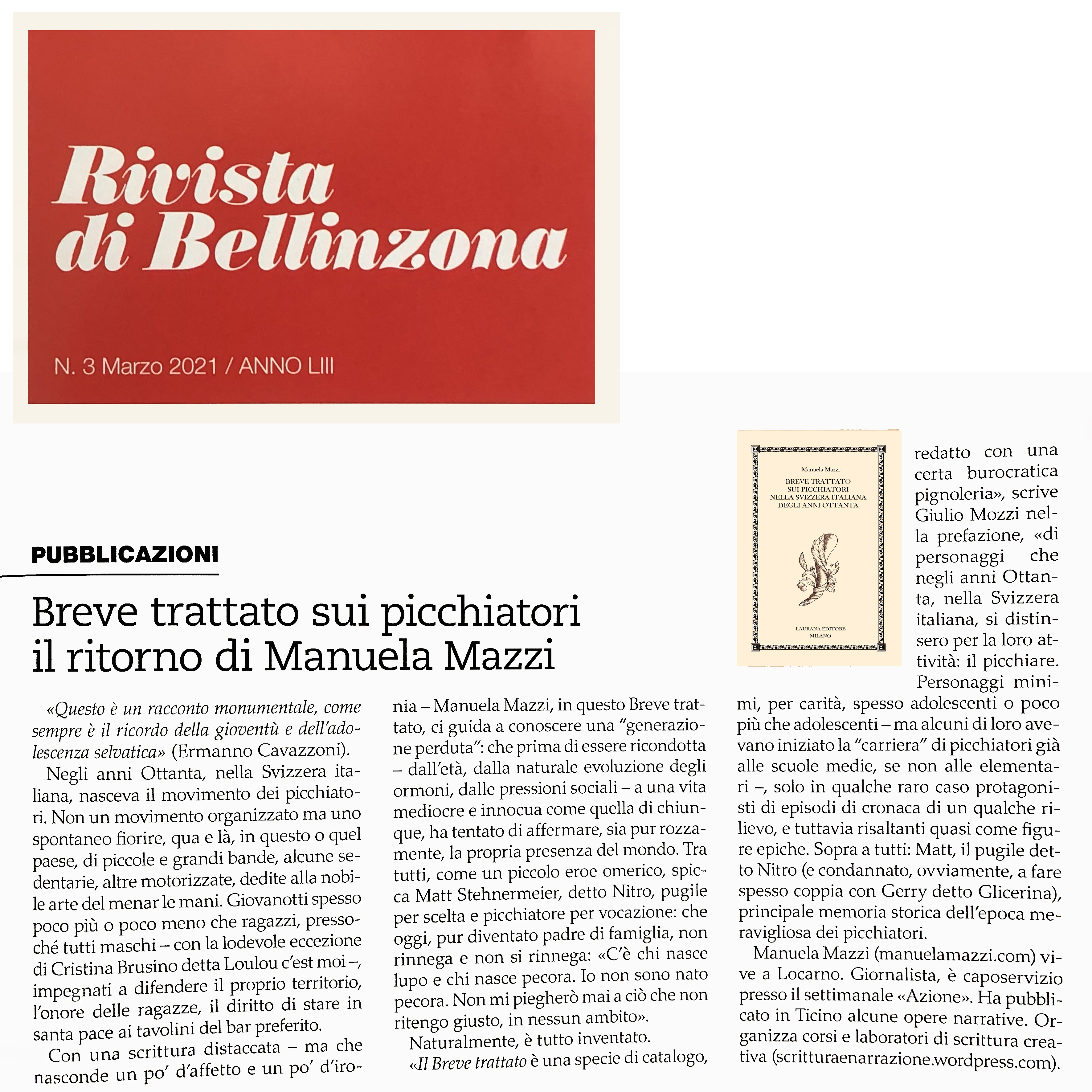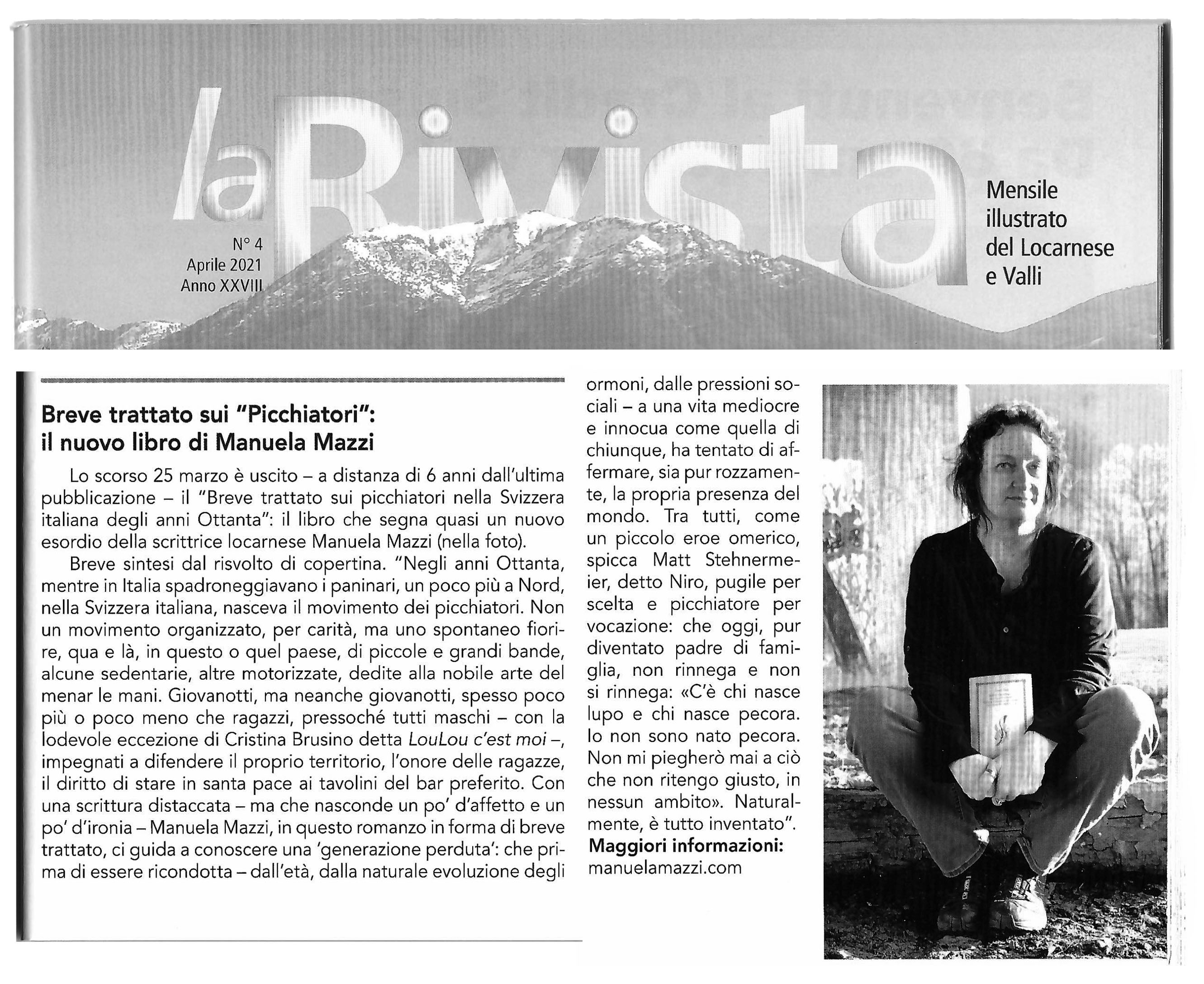 Ringrazio il critico Sergio Roic che ha scritto una recensione del “Breve trattato sui picchiatori nella Svizzera italiana degli anni Ottanta” pubblicata oggi sulle pagine culturali del Corriere del Ticino.