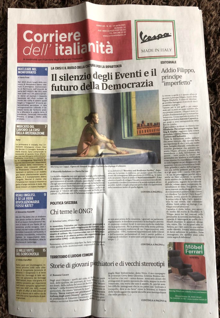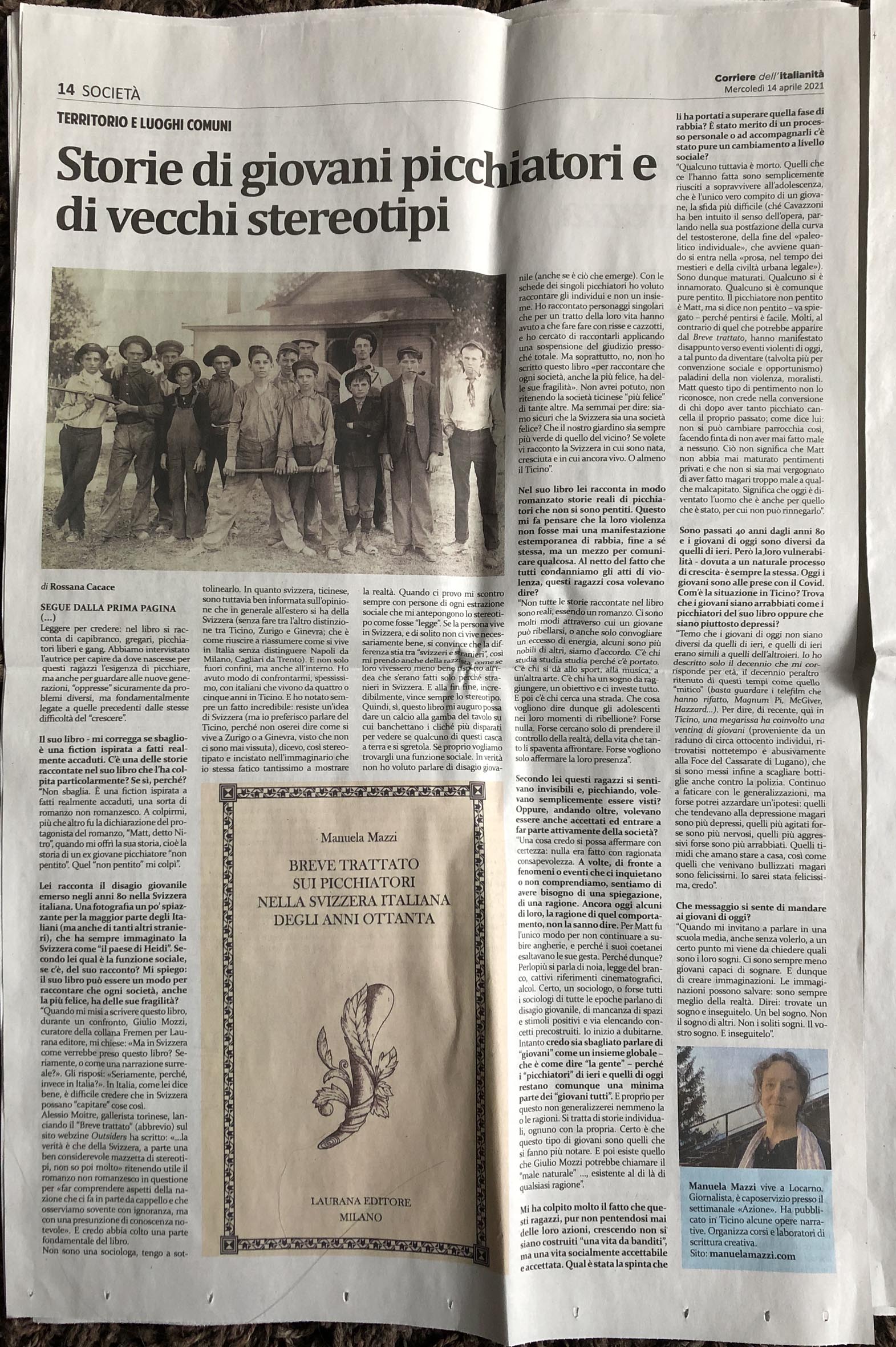 Ringrazio Rossana Cacace, direttrice del Corriere dell’italianità, giornale con sede a Zurigo, per aver dato tanto spazio all”intervista dedicata al “Breve trattato sui picchiatori nella Svizzera italiana degli anni Ottanta”, edito da Laurana editore, Milano, e secondo titolo della collana ‘fremen’ a cura di Giulio Mozzi. (Il 15 aprile 2021)