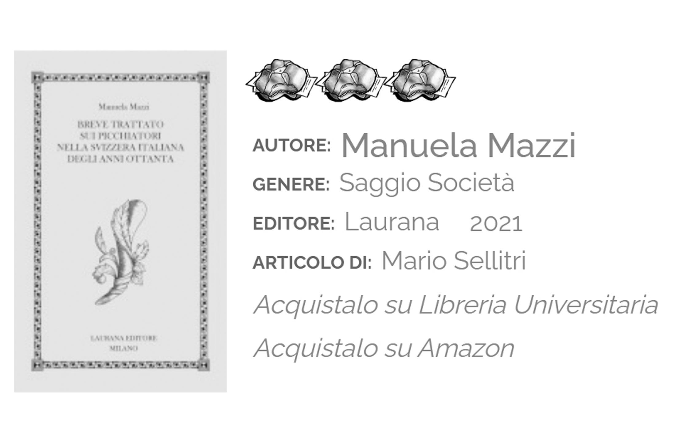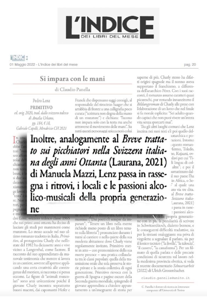 Lusinga molto essere accostati ad autori svizzeri noti come Pedro Lenz. È accaduto sull’Indice dei libri del mese (maggio 2022), grazie a Claudio Panella (dottore di ricerca in letterature comparate all’Università di Torino) che ha citato il Breve trattato sui picchiatori nella Svizzera italiana degli anni Ottanta nella recensione di Primitivo, l’ultimo romanzo del bernese tradotto anche in italiano: «Inoltre, analogamente al Breve trattato sui picchiatori nella Svizzera italiana degli anni Ottanta (Laurana, 2021) di Manuela Mazzi, Lenz passa in rassegna i ritrovi, i locali e le passioni alcolico-musicali della propria generazione».