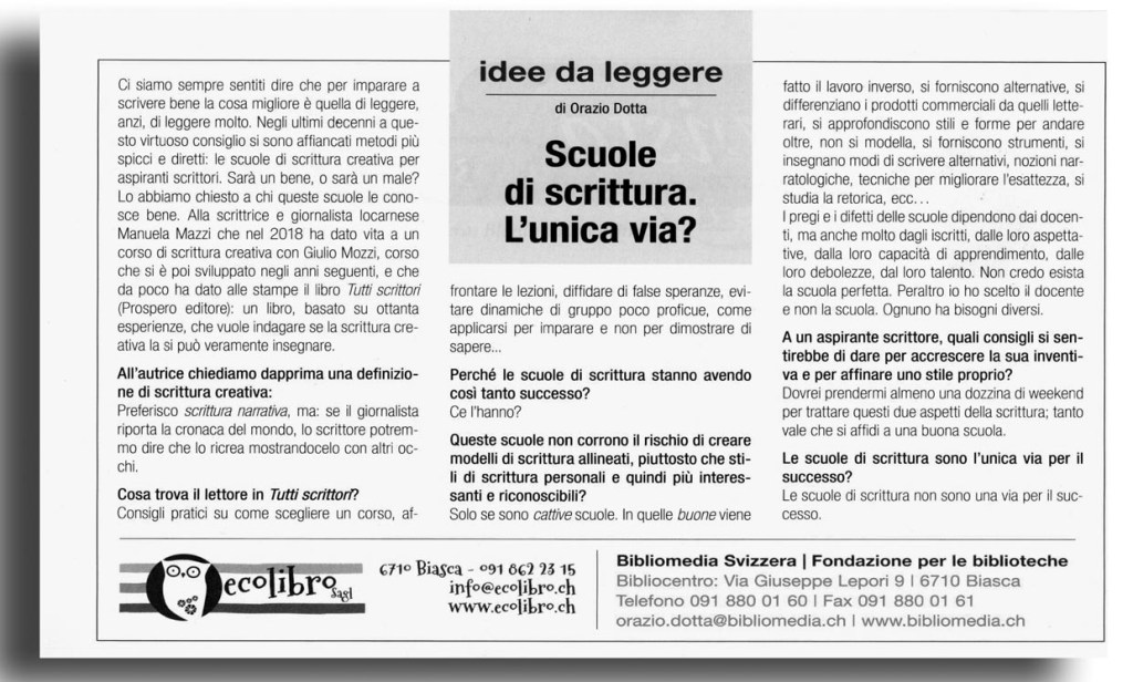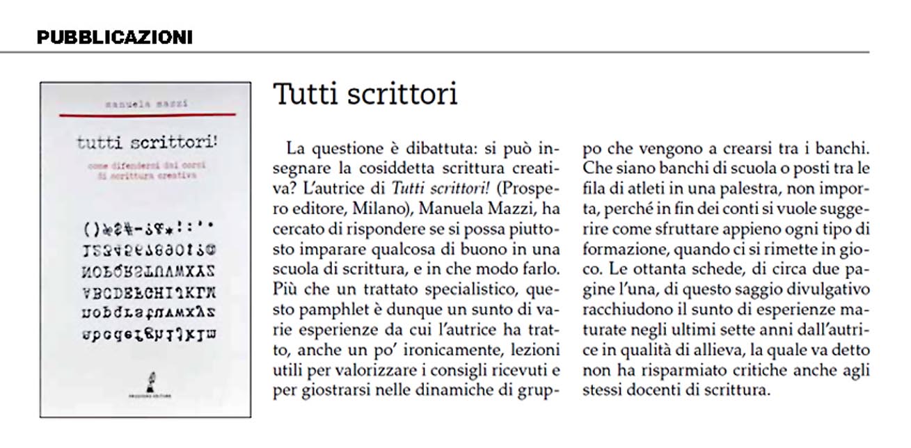 Ringrazio Nicola Mazzi per aver pubblicato sulla Rivista di Bellinzona la segnalazione di Tutti scrittori! Come difendersi dai corsi di scrittura creativa.