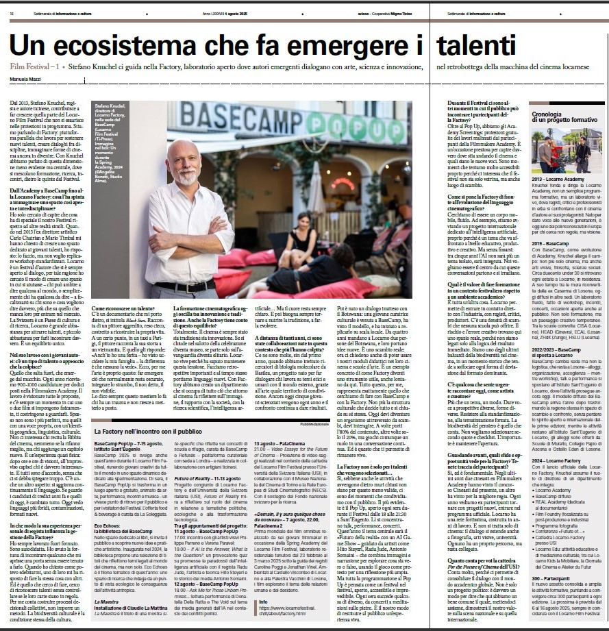 Sul settimanale svizzero “Azione” l’intervista che ho avuto il piacere di fare in merito al progetto Factory del Locarno Film Festival, diretto da Stefano Knuchel.