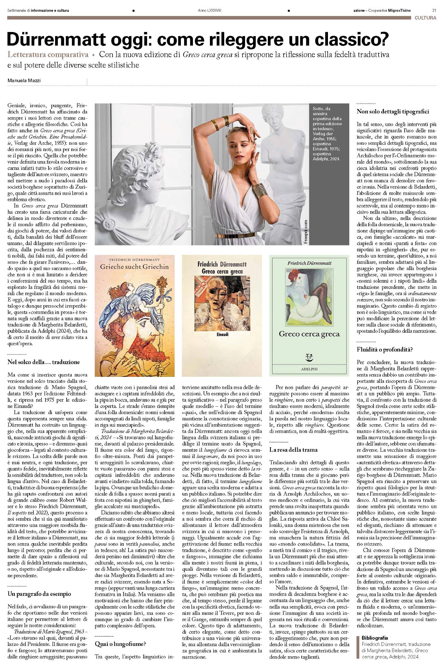 Nel settimanale Azione, la mia riflessione sulla nuova traduzione italiana (di Margherita Belardetti) di Greco cerca greca di Dürrenmatt, dove parlo di identità letteraria, fedeltà geoculturale e di… borghesia.