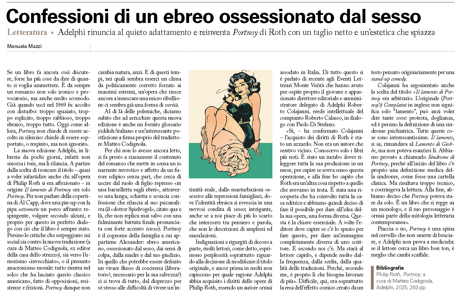 Nel settimanale “Azione”, per le pagine culturali, è uscita questa mia nota sulla riedizione adelphiana di “Portnoy” di Philip Roth. Qui il link (gratuito senza richiesta di iscrizione).