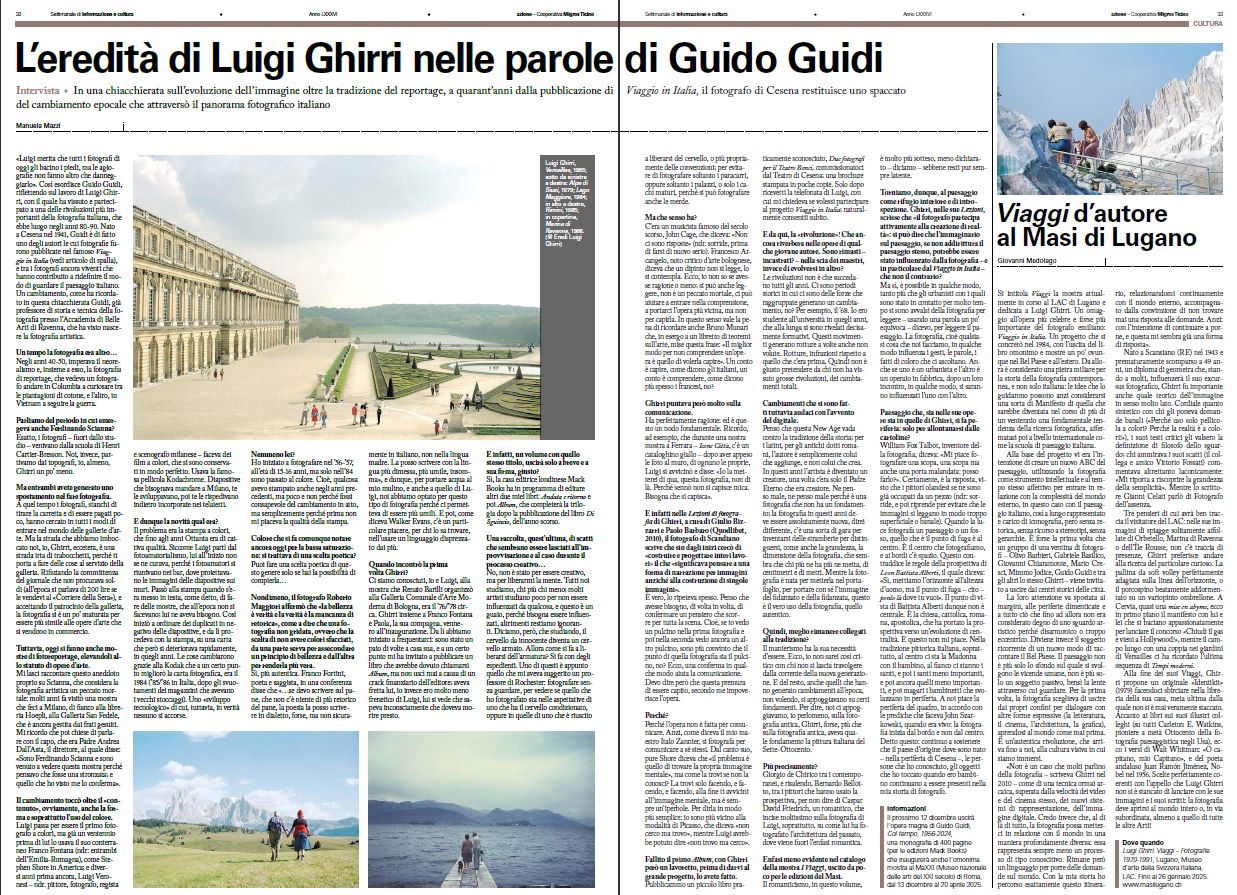 È uscita di recente, sul settimanale Azione, la critica alla mostra di Luigi Ghirri al Masi/Lac di Lugano, e scritta da Giovanni Medolago, con una mia “chiacchierata” concessami da Guido Guidi, sulla fotografia di ieri e di oggi. L’articolo può essere letto anche online seguendo questo link (non servono iscrizioni; è gratuito), oppure scrollando la pagina verso il basso.