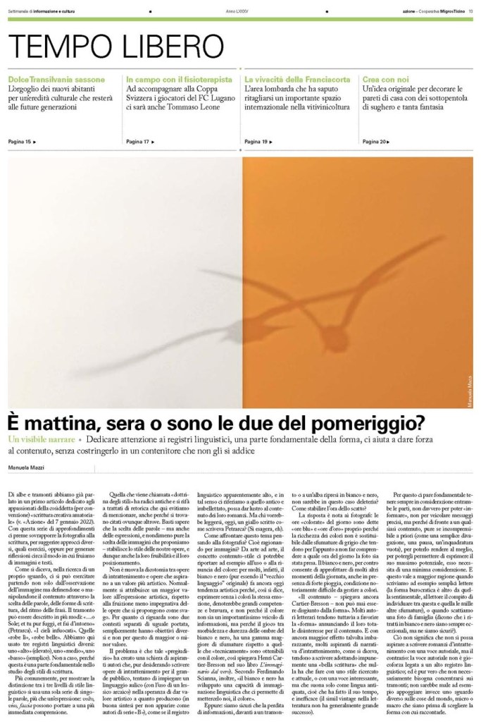È uscito oggi su Azione il primo articolo che ho scritto sul tema Un visibile narrare. La versione integrale del testo – per chi desidera leggerlo ma non ha accesso al cartaceo – si trova scrollando verso il basso oppure online (non richiede iscrizioni perché è un settimanale d’approfondimento gratuito) a questo indirizzo!