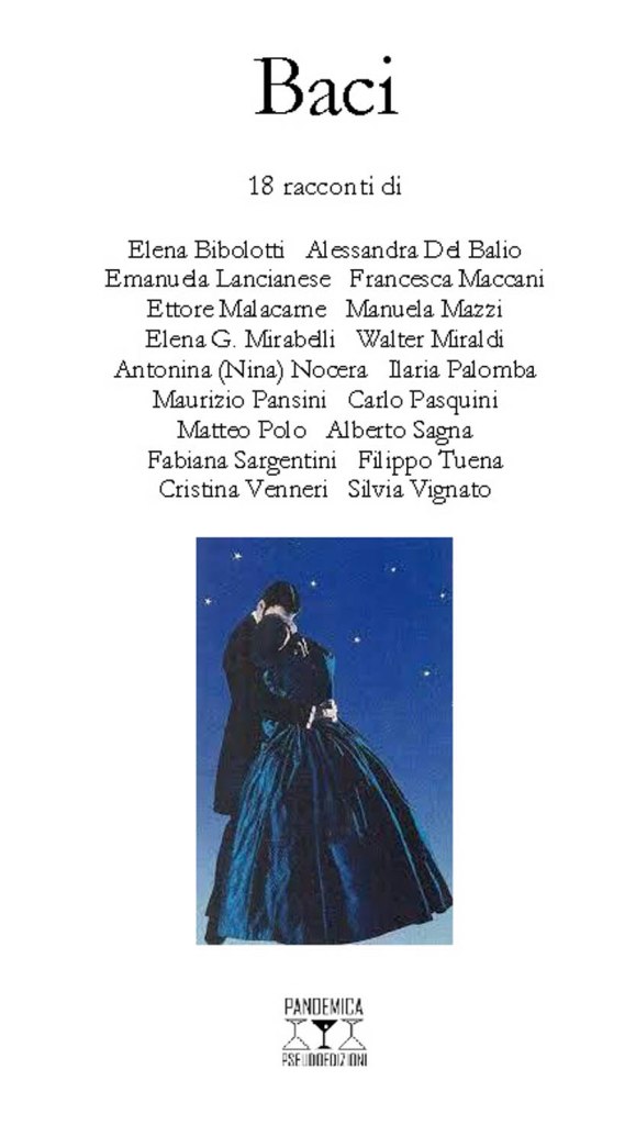 Dopo aver esordito, il 14 dicembre 2020, con la raccolta «Cene di Natale», la Pandemica Pseudoedizioni – che ha per scopo la pubblicazione in pdf dei racconti di una ventina di autori che si sono riuniti in tempo pandemico per tenersi allegri, scrivere, e «contagiare» tutti con letture diversificate e GRATUITE – esce oggi, alla viglia di Natale del 2021 con una nuova raccolta in tema di «Baci».