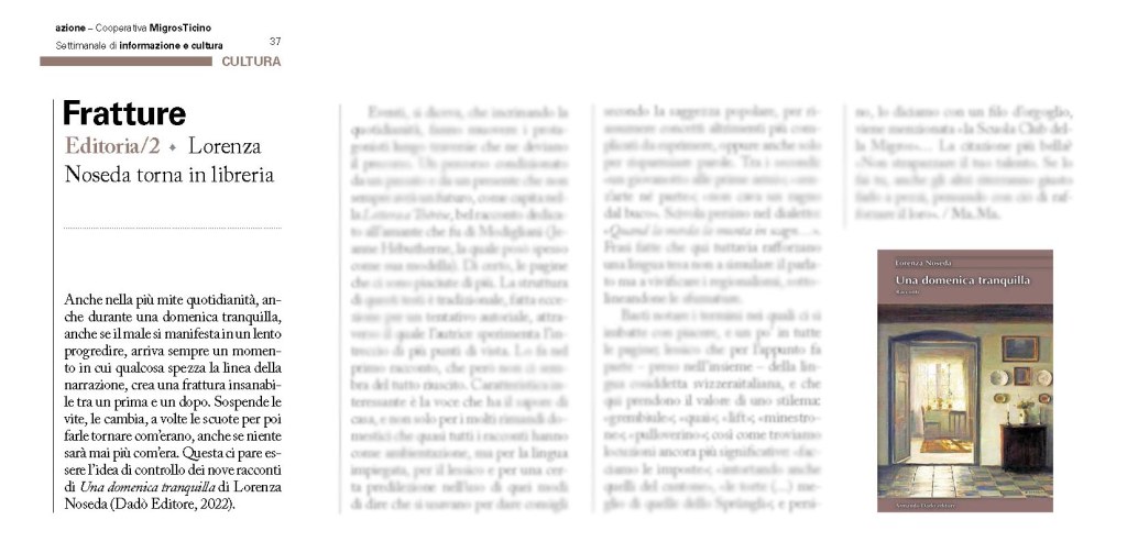 Ho letto Una domenica tranquilla (Dadò editore, 2022) di Lorenza Noseda e ne ho scritto su Azione. La versione integrale del testo – per chi desidera leggerlo ma non ha accesso al cartaceo – si trova scrollando verso il basso oppure online (non richiede iscrizioni perché è un settimanale d’approfondimento gratuito).