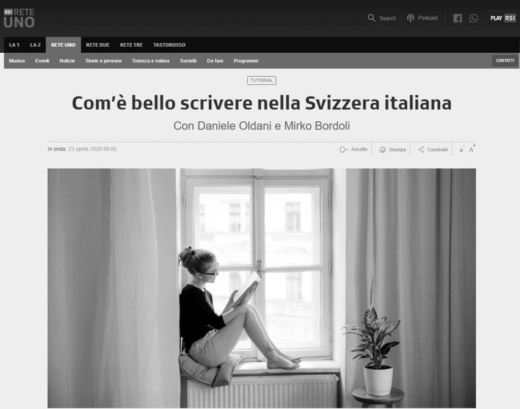 Gli autori di “Tutorial”, trasmissione radiofonica di ReteUno della RSI, mi hanno invitata a far due chiacchiere sullo scrivere nella Svizzera italiana nella giornata dedicata a libro (il 23 aprile 2020 dalle 09:30/09:45 alle 10:15).