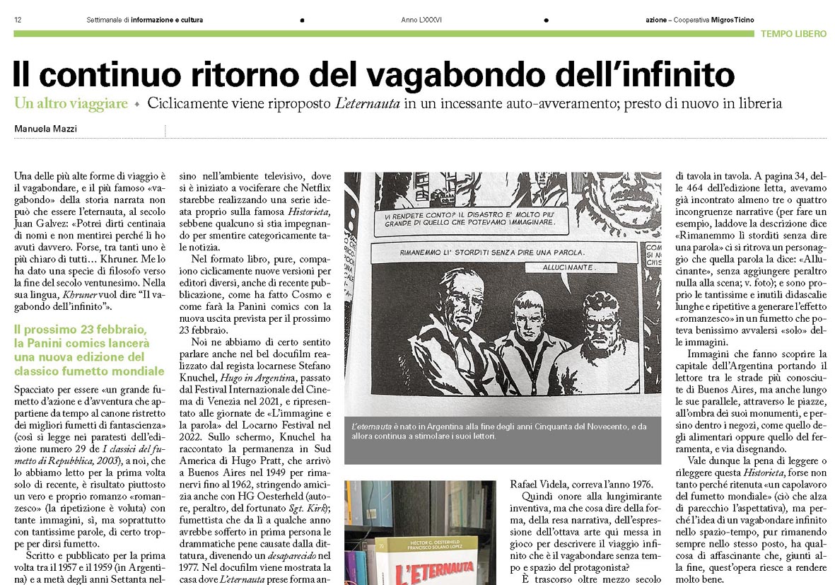 Noi ne abbiamo di certo sentito parlare anche nel bel docufilm realizzato dal regista locarnese Stefano Knuchel, Hugo in Argentina, passato dal Festival Internazionale del Cinema di Venezia nel 2021, e ripresentato alle giornate de «L’immagine e la parola» del Locarno Festival nel 2022. Sullo schermo, Knuchel ha raccontato la permanenza in Sud America di Hugo Pratt, che arrivò a Buenos Aires nel 1949 per rimanervi fino al 1962, stringendo amicizia anche con HG Oesterheld (autore, peraltro, del fortunato Sgt. Kirk); fumettista che da lì a qualche anno avrebbe sofferto in prima persona le drammatiche pene causate dalla dittatura, divenendo un desaparecido nel 1977. Nel docufilm viene mostrata la casa dove L’eternauta prese forma anticipando – ed è questo uno dei massimi riconoscimenti che viene attribuito al fumetto di Oesterheld rimasto al pari di una pietra miliare nella storia delle immaginazioni – ciò che sarebbe successo in Argentina con la salita al potere della giunta militare alla cui testa sedette Jorge Rafael Videla, correva l’anno 1976.