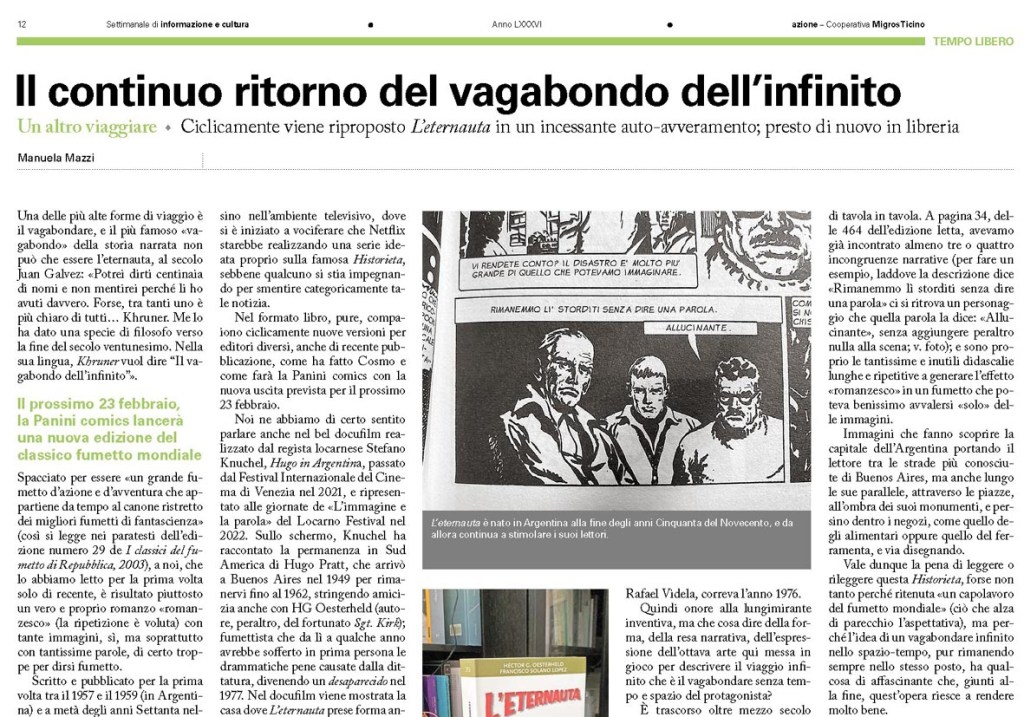 Scritto e pubblicato per la prima volta tra il 1957 e il 1959 (in Argentina) e a metà degli anni Settanta nella versione italofona (testi di Héctor Germán Oesterheld, illustrazioni di Francisco Solano Lopez, con traduzione di Stelio Rizzo), L’eternauta ciclicamente torna a far parlare di sé, quasi fosse il continuo avverarsi della storia narrata; è tornato alla ribalta anche negli ultimi due anni persino nell’ambiente televisivo, dove si è iniziato a vociferare che Netflix starebbe realizzando una serie ideata proprio sulla famosa Historieta, sebbene qualcuno si stia impegnando per smentire categoricamente tale notizia.